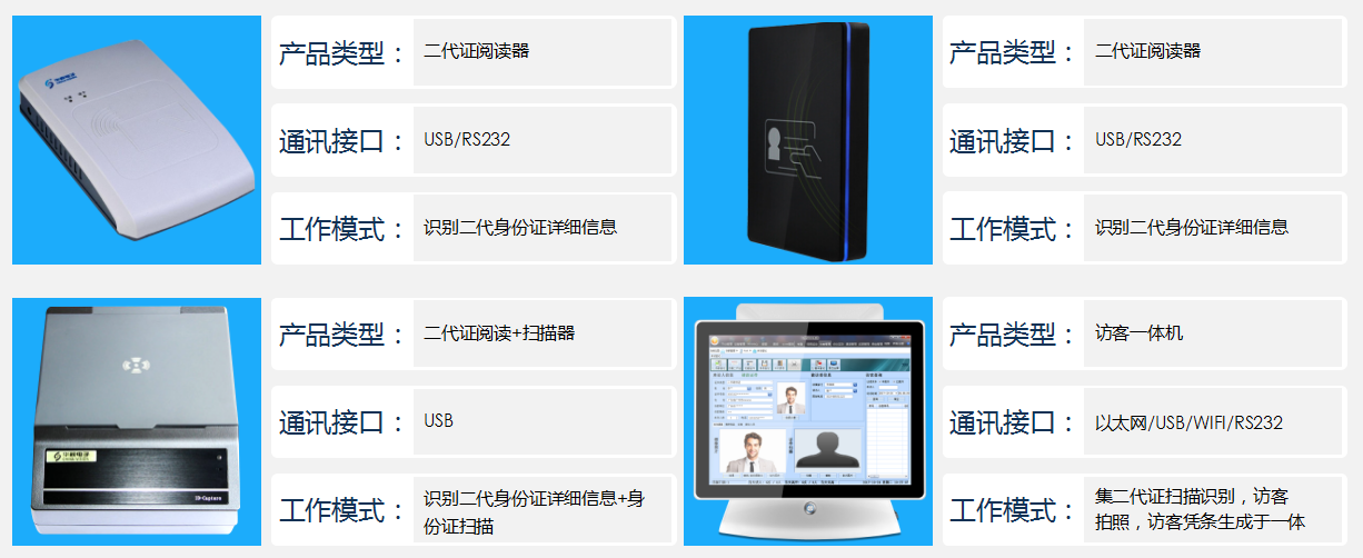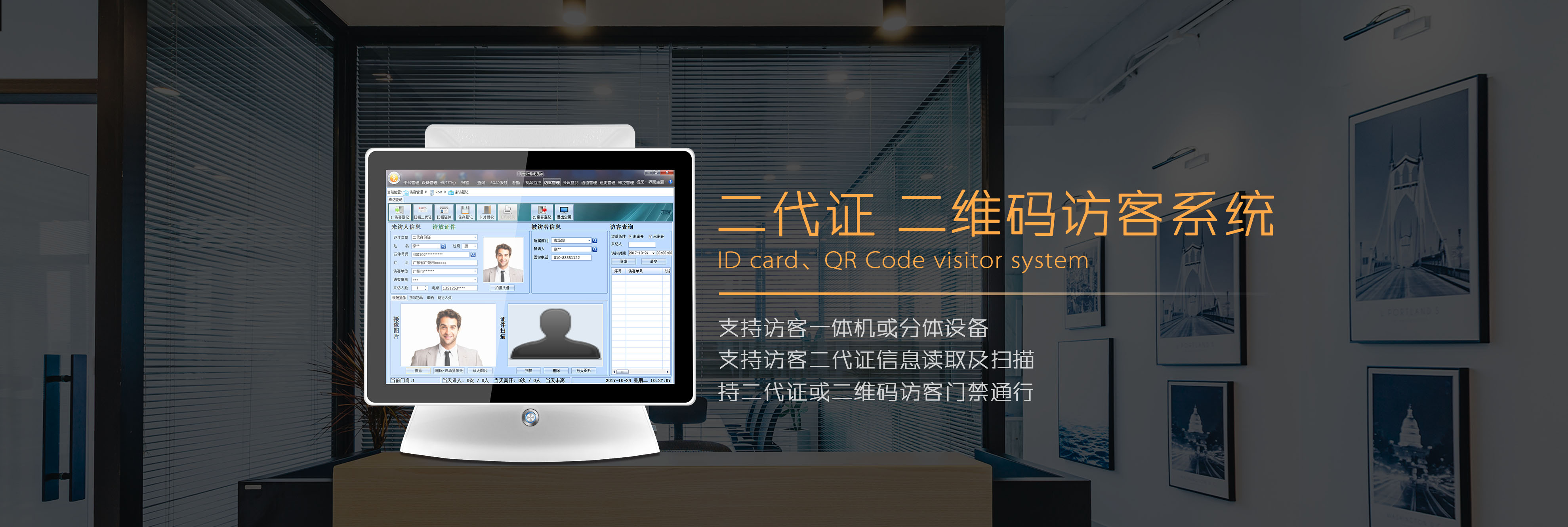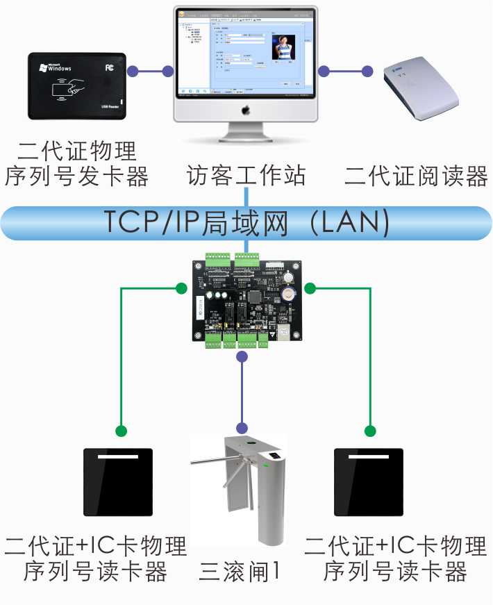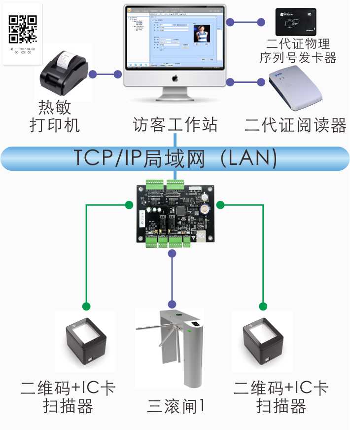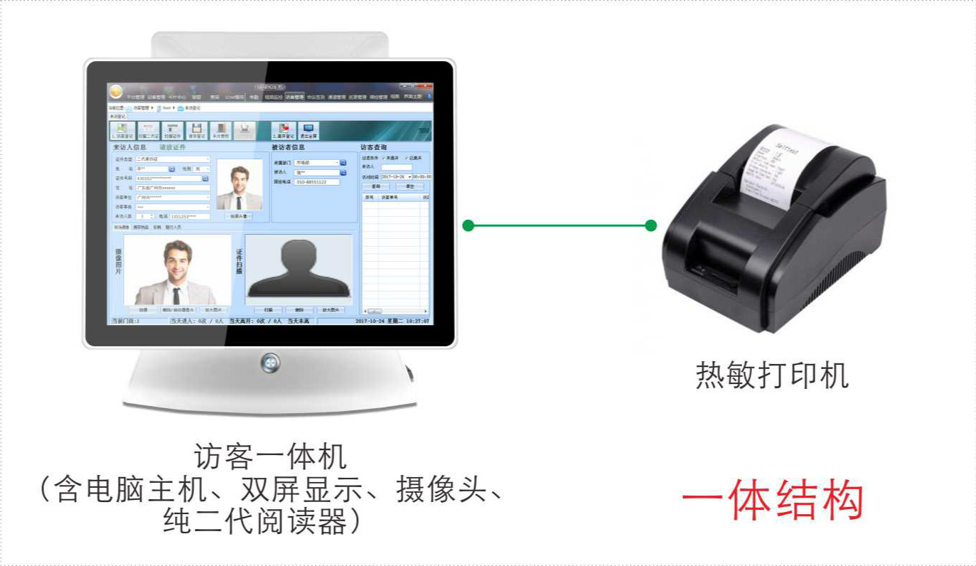 接配件,如二代证阅读器、热敏打印机、摄像头、扫码器等组成整个访客登记系统。