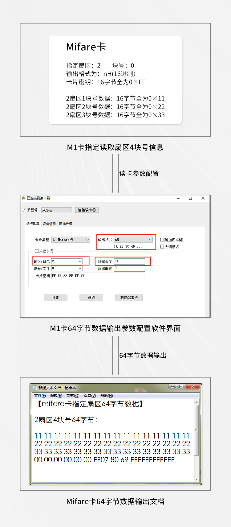 ◈ 输出字节: 支持最大64字节扇区数据(1个扇区/4个块号数据)输出