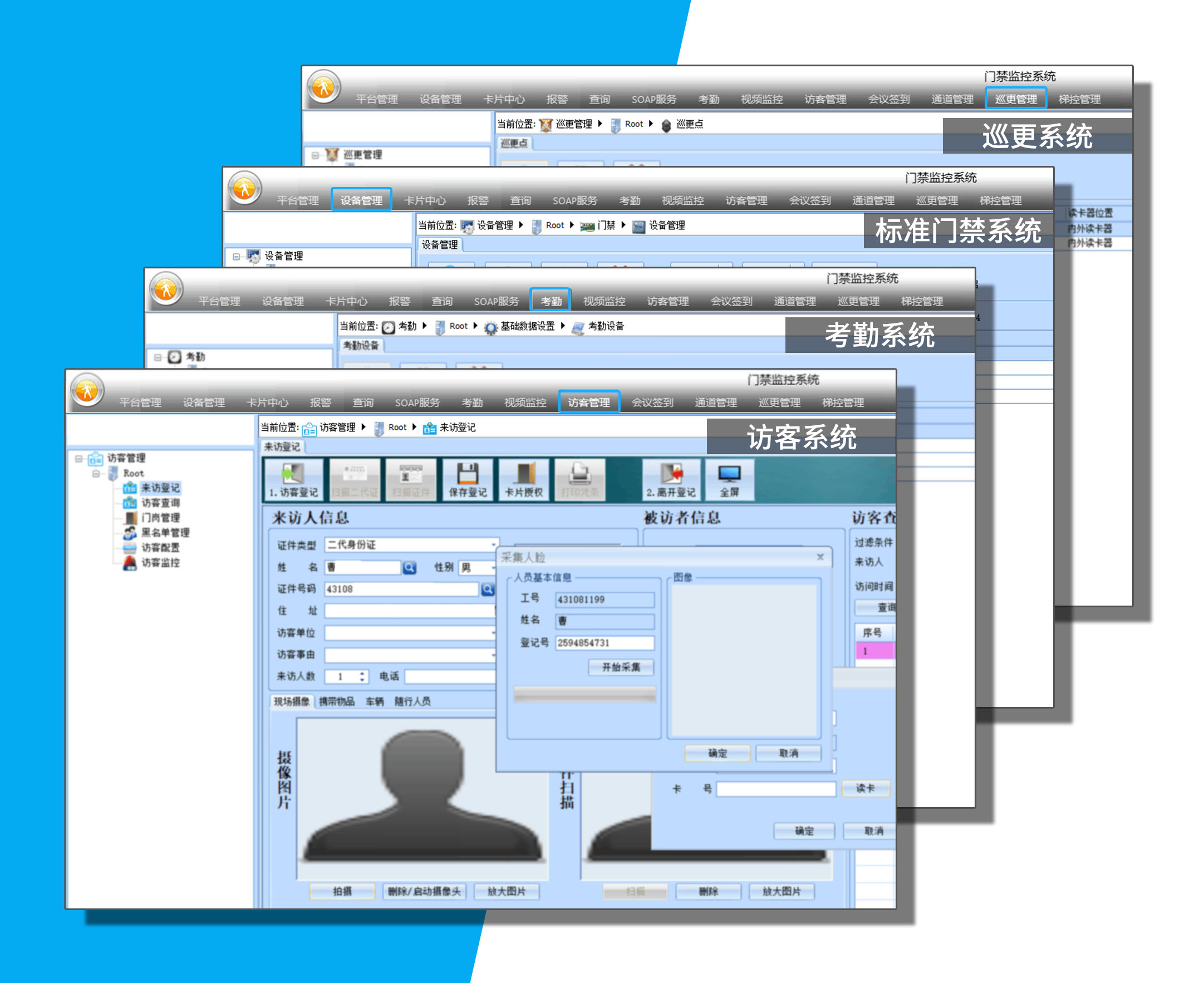 C/S门禁软件管理,支持标准门禁系统、考勤系统、访客系统、巡更系统等