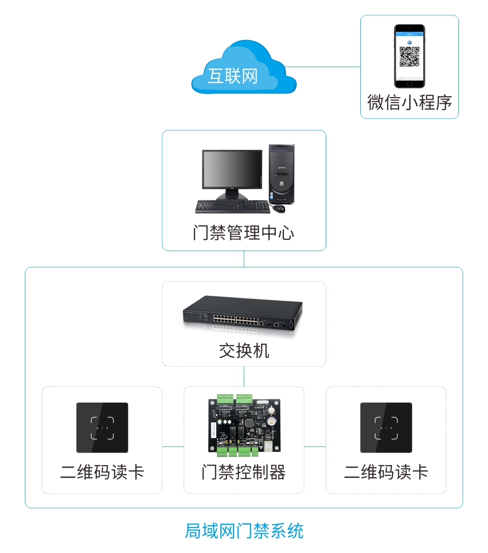 微信二维码开门系统通过手机微信小程序扫码开门及访客二维码分享取代传统的门禁卡片和机械钥匙门,通过将手机号码做为卡号下载到门禁控制器中,手机微信小程序用手机号进行注册并生成动态二维码扫码开门,同时可实现按年、月、日、时、分生成访客二维码分享,适用于办公室使用场合。
