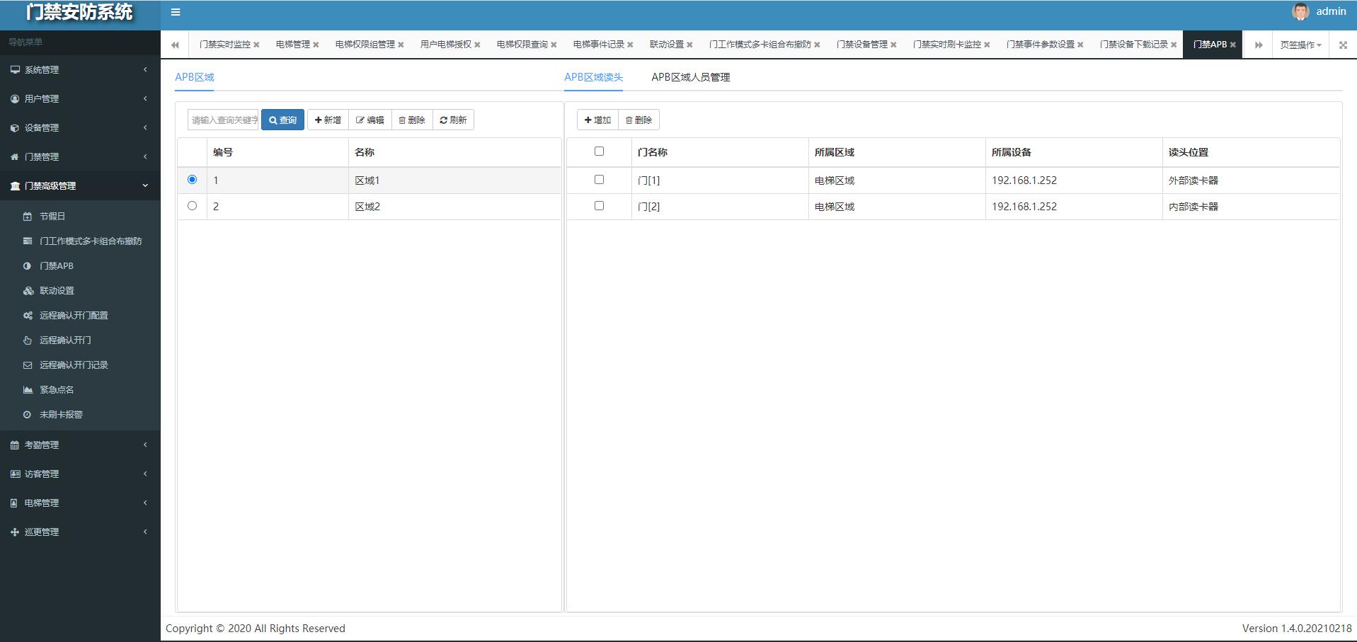 全局APB防潜回系统仅需通过B/S服务器即可实现不同区域、不同门禁控制器间的APB防潜回功能。要求用户按照规定路线行走,若违反行走规则禁止通行,通过系统可获取指定区域内实际人数信息及对人员当前区域进行手动修改。