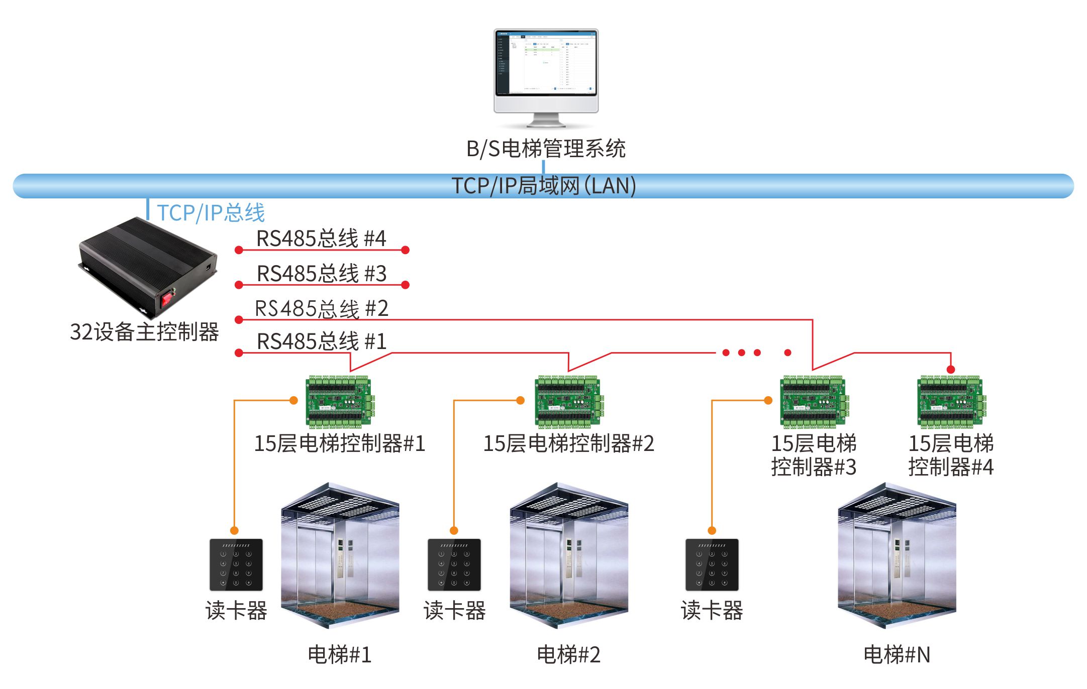 主控制器与电脑采用以太网联网,主控制器与电梯控制器采用RS485联网,主控制器支持4路485输出,主控制器最大支持32台电梯控制器的联网,每台电梯控制器控制15层选层与直达。