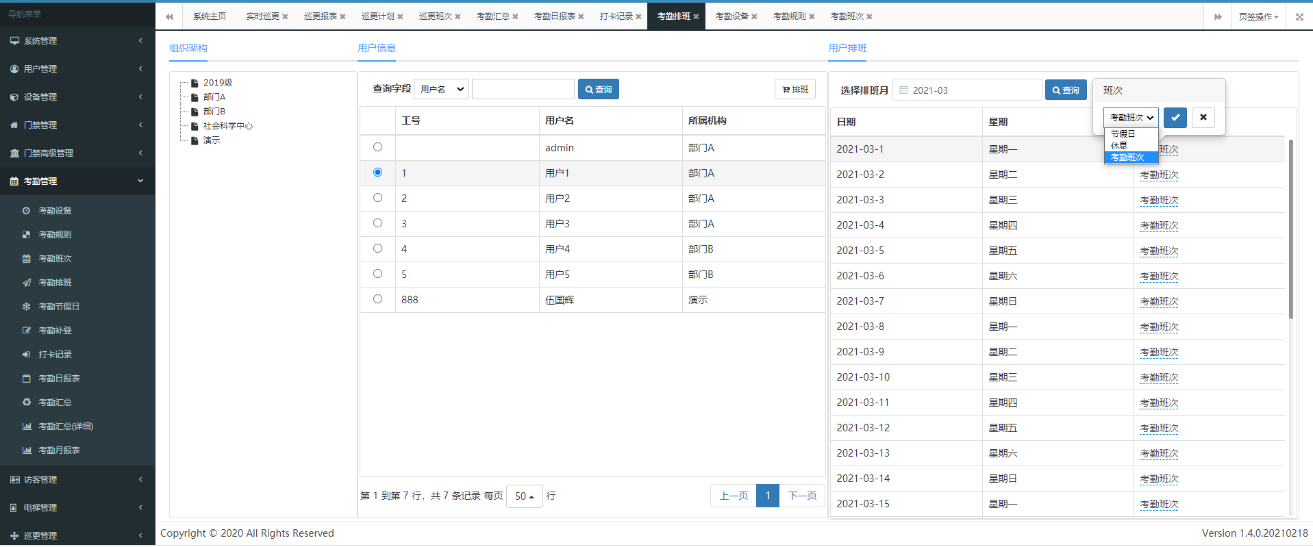 考勤系统可对考勤人员按照“规律班次”、“自定义班次”等方式进行排班。