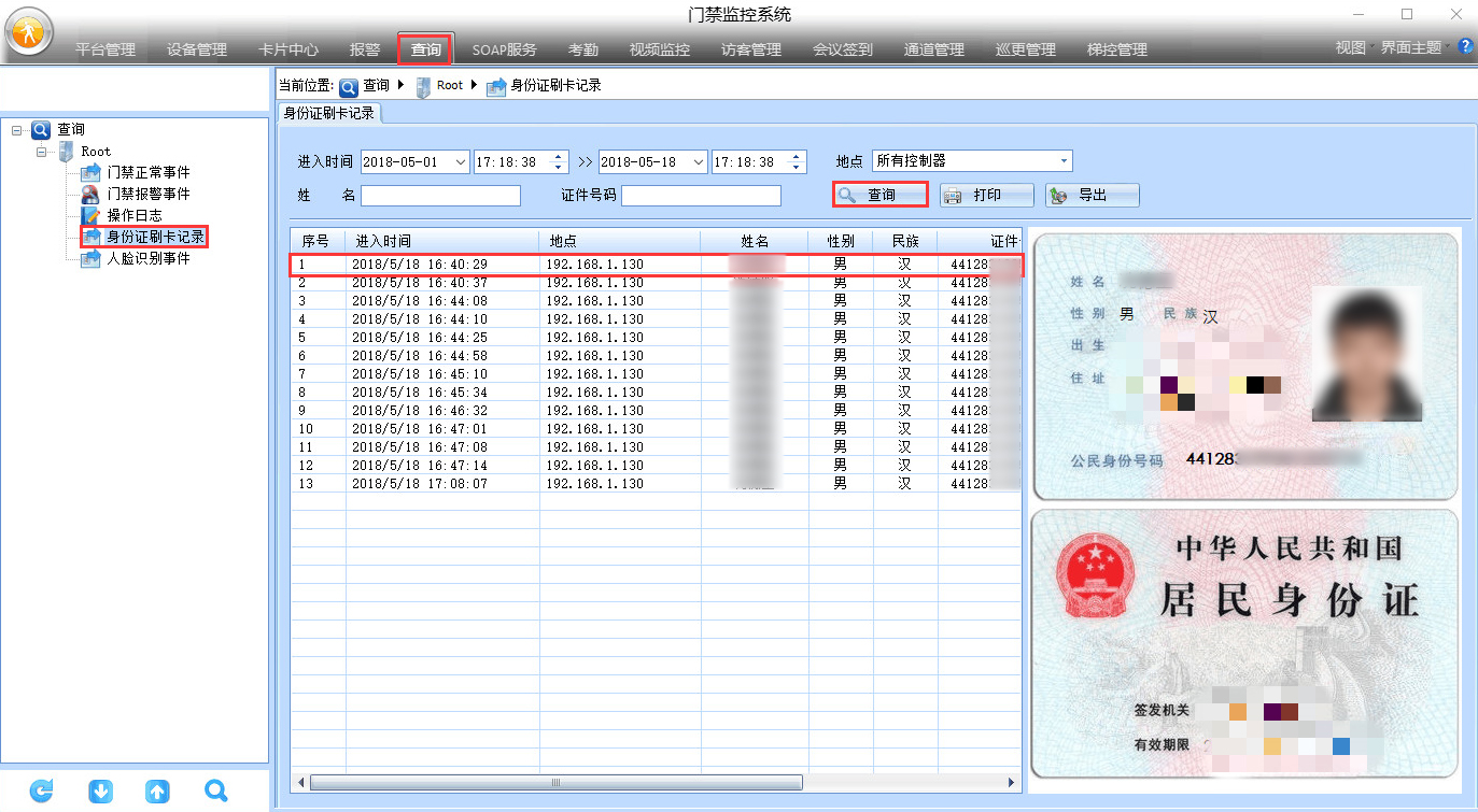 系统对读取到的身份证信息进行后台软件存储,用于后续事件的查询和追踪。