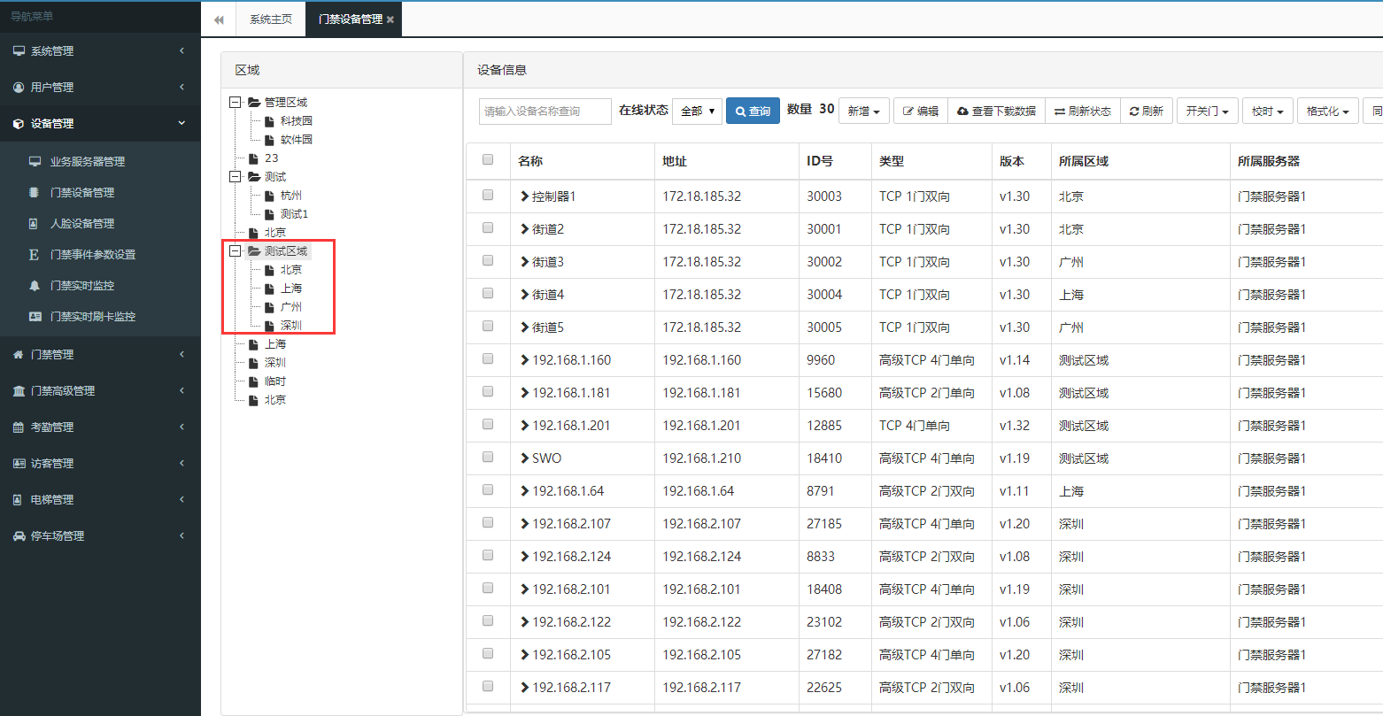 门禁控制器上电后即主动向云端服务器软件系统发起连接请求,云端服务器软件可实现跨区域设备的连网功能。