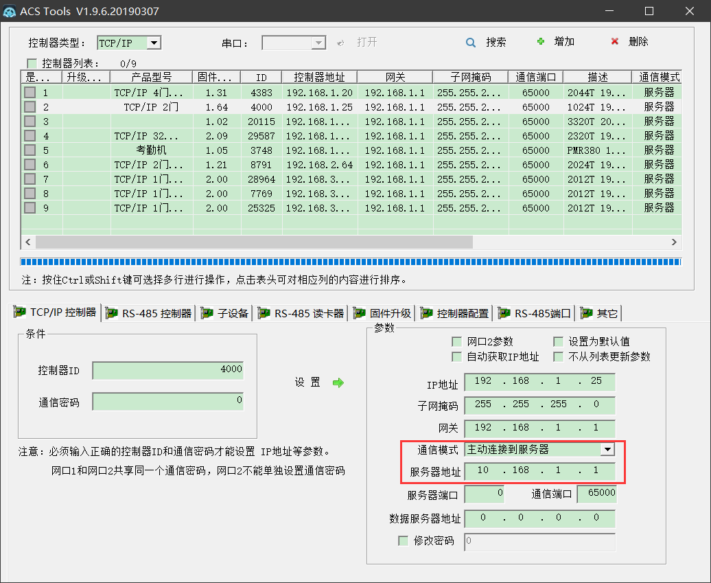 配置门禁控制器硬件为主动联网模式,将云端服务器提供的固定IP地址设置到门禁控制器中。
