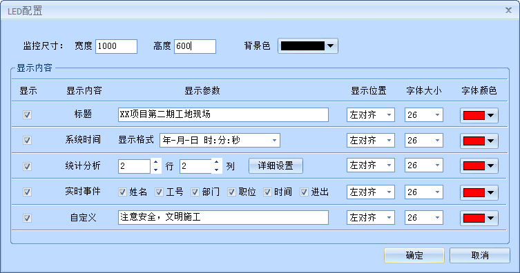 配置LED屏显示尺寸、自定义标题内容、监控角色类型、实时事件显示及字体大小配置等。