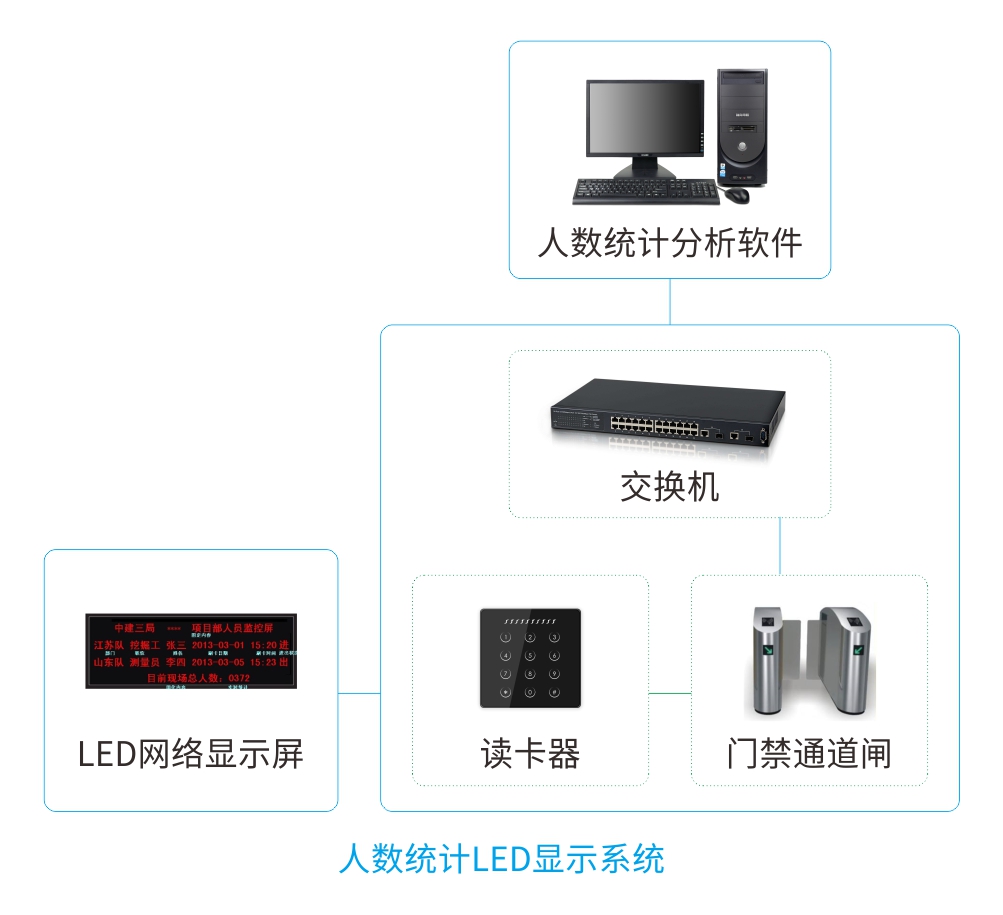 工厂通道LED监控系统对指定通道闸、指定角色人员、指定部门人员,实现按“出入总人数“或”角色工种“统计分析。现场LED屏支持以太网联网,实时抓取电脑显示内容,适用于工厂或工地对人数统计LED显示的场合。
