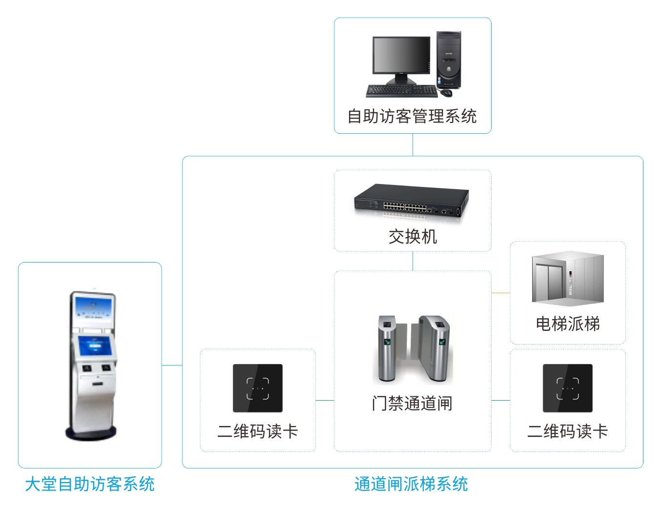 访客到达大堂后,通过自助访客机进行被访单位查询。访客登录身份证信息后自助打印二维码凭条,访客持凭条可进行一次性的通道闸扫码进出,访客进闸后同时联动电梯接待访客到达被访人楼层。内部员工可支持普通刷卡或人脸方式进出。