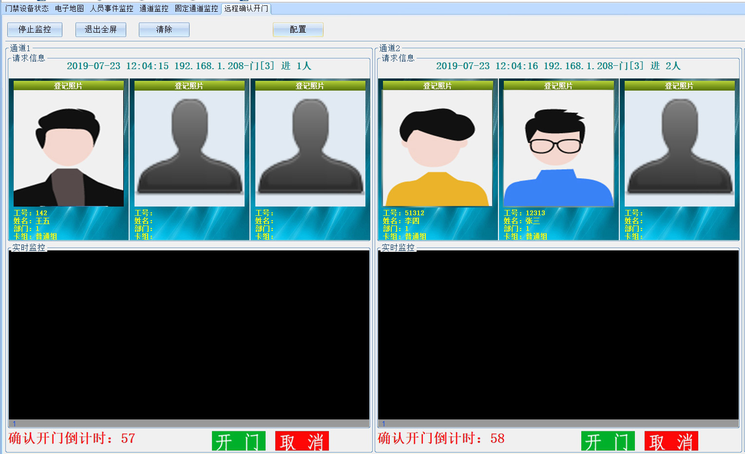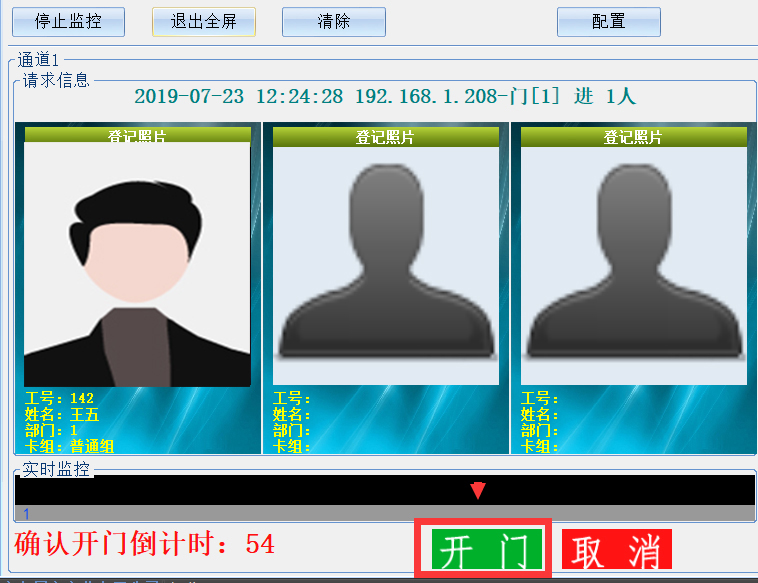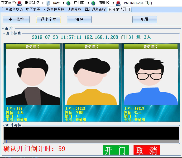 现场多个人员刷卡后现场不执行开锁动作(没有人申请管理中心不能远程开门),监控中心自动弹出现场多卡人员照片和信息。管理人员通过历史照片及实时视频监控确认现场人员身份后,点击【开门】按钮实现远程打开指定门点。