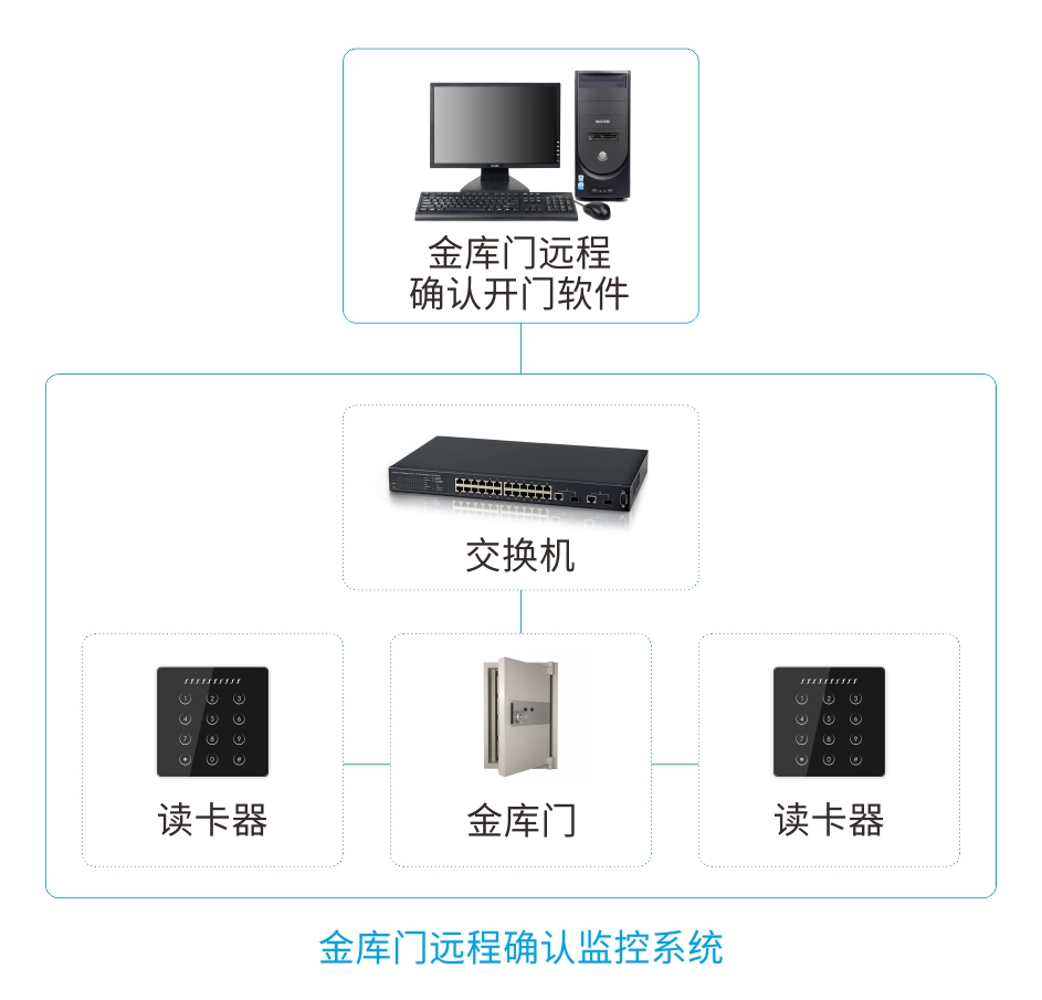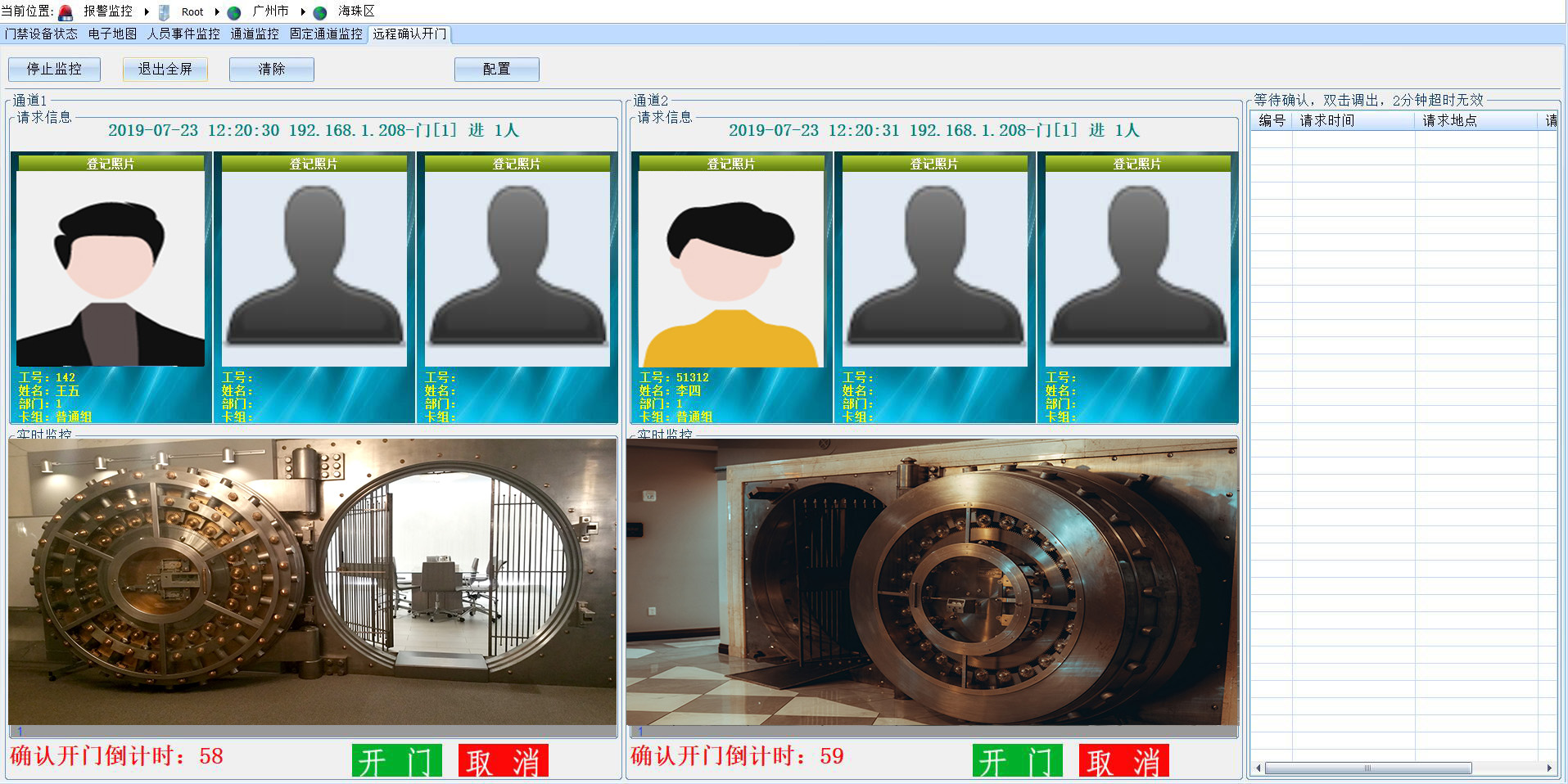 针对银行金库门等高安全等级控制场合,本方案可实现现场人员1人或多人刷卡(指纹或人脸)后现场门点不会打开,远程监控中心软件弹出该刷卡人员开门请求信息,同时联动现场摄像机进行实时视频监控。仅当监控中心管理人员远程确认后才允许开启现场门点,现场人员或监控中心操作人员均不能单方控制开门。