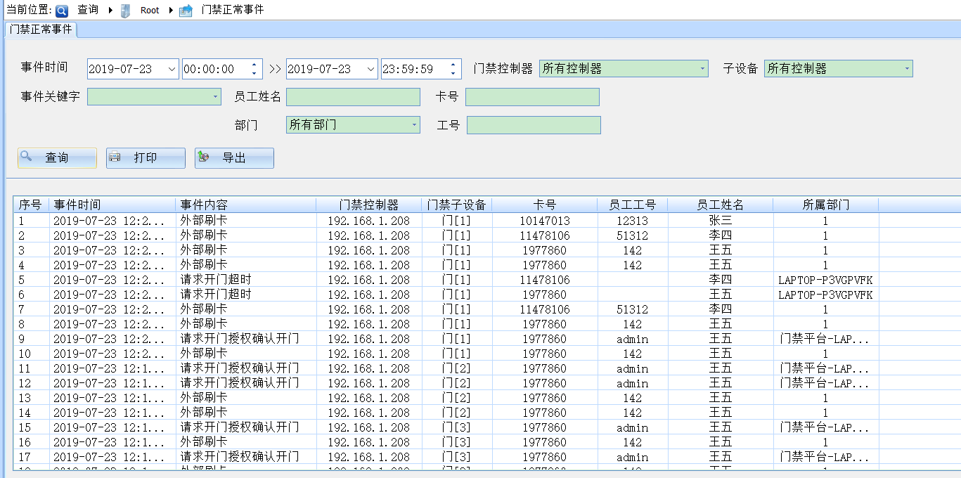 进入【查询】工作站,所有的刷卡事件或报警事件记录均可在系统中查询。