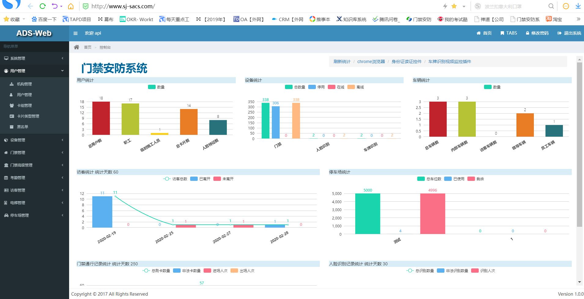 软件采用B/S网页管理,系统可部署到本地或云端私有云系统,只要能上网的地方打开网页即可实现远程监控管理功能。系统支持“访客”、“考勤”、“车牌识别”、“电梯”等一卡通系统功能。
