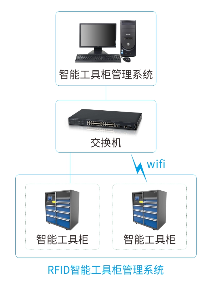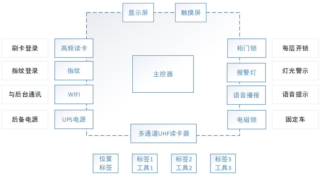 为更加方便智能化的管理工具,防止工具落在生产线上或借出不归还,造成不可预估的影响和损失,需对工具柜内的工具进行智能化的管理。本系统每个工具柜的物理结构均为一致,可实现柜内工具借出管理、自动盘点、使用记录、报警管理和权限管理等功能。