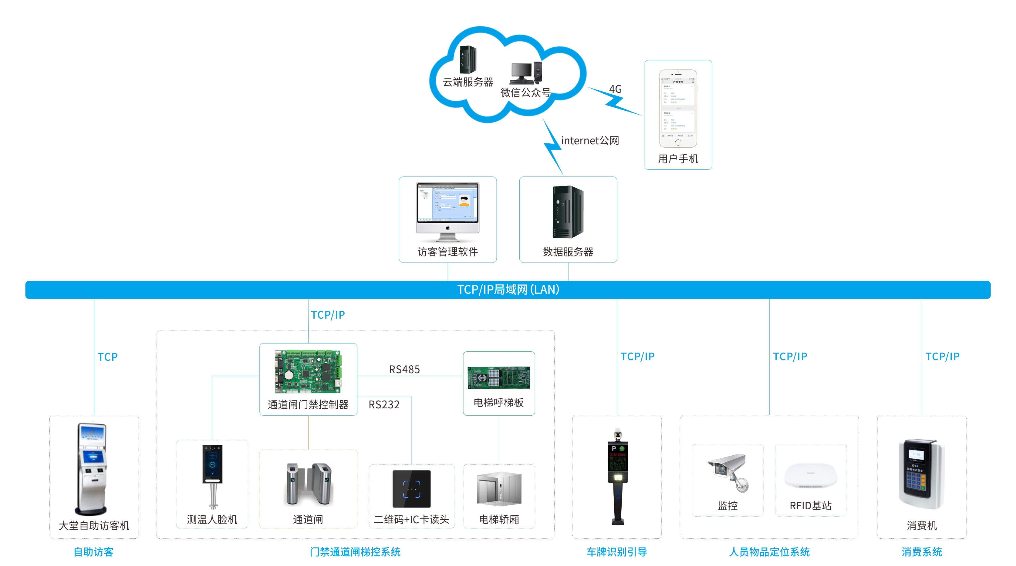 针对高档写字楼、重要工厂等区域对来访人员管理难的问题。本系统通过手机端技术为基础,实现了访客手机端自助预约、被访人手机端审核,访客人脸(二维码)通道闸通行、车牌识别自动放行、电梯直达被访楼层等统一管理,实现智能化楼宇的自助访客整体解决方案。