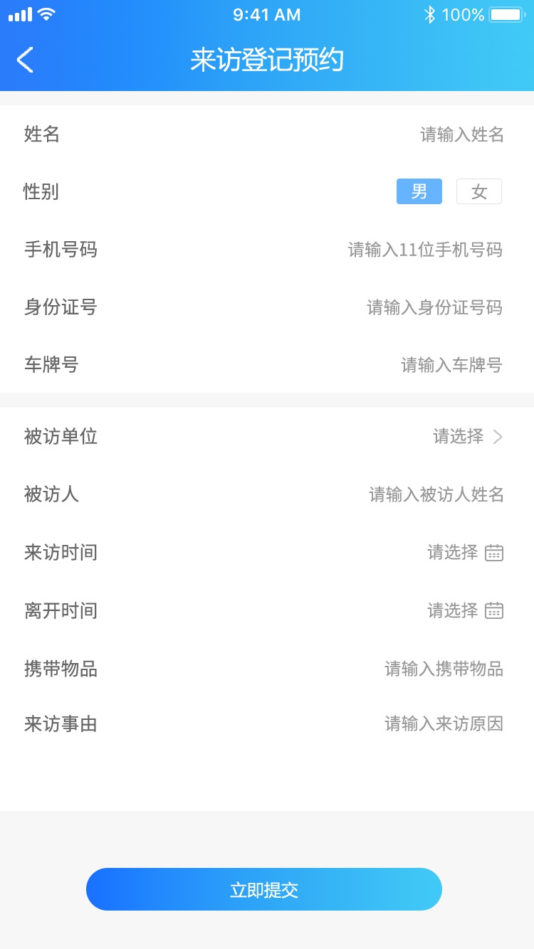 访客通过手机微信小程序进行访问申请,填写好个人资料及进行人脸采集。